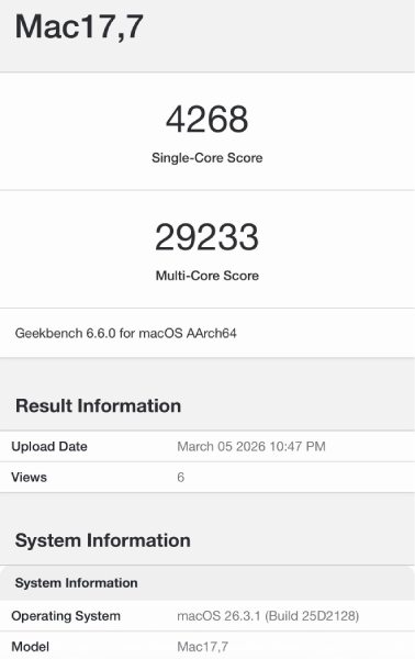 Согласно данным MacRumors, протестированная конфигурация оснащена 18-ядерным CPU, и в многоядерном тесте она показала себя просто блестяще. Чип набрал 29 233 балла, что выше результата M3 Ultra (27 726 баллов), хотя у последнего целых 32 ядра.